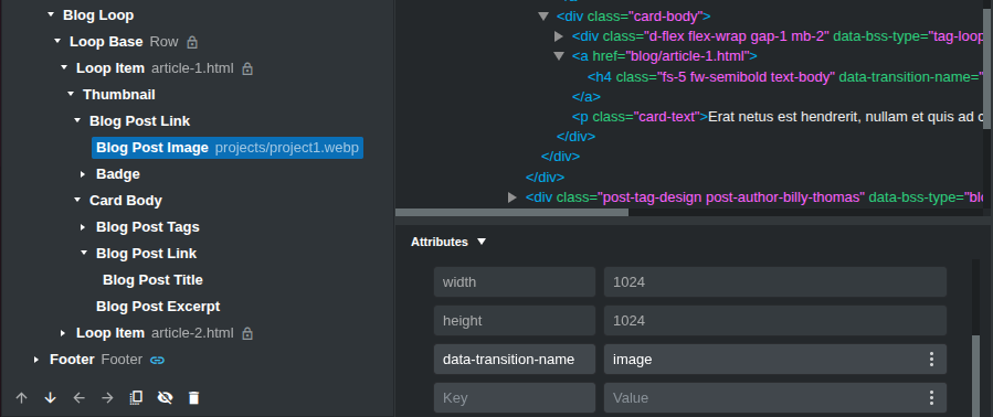 Add a custom data- attribute with the desired transition name to an item in the Blog Loop (from the Attributes panel - data-transition-name in the example). This attribute will be applied to all blog loop items.