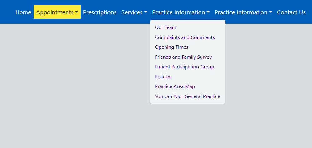 I then click the Practice Information dropdown and the Appointments menu stays highlighted.