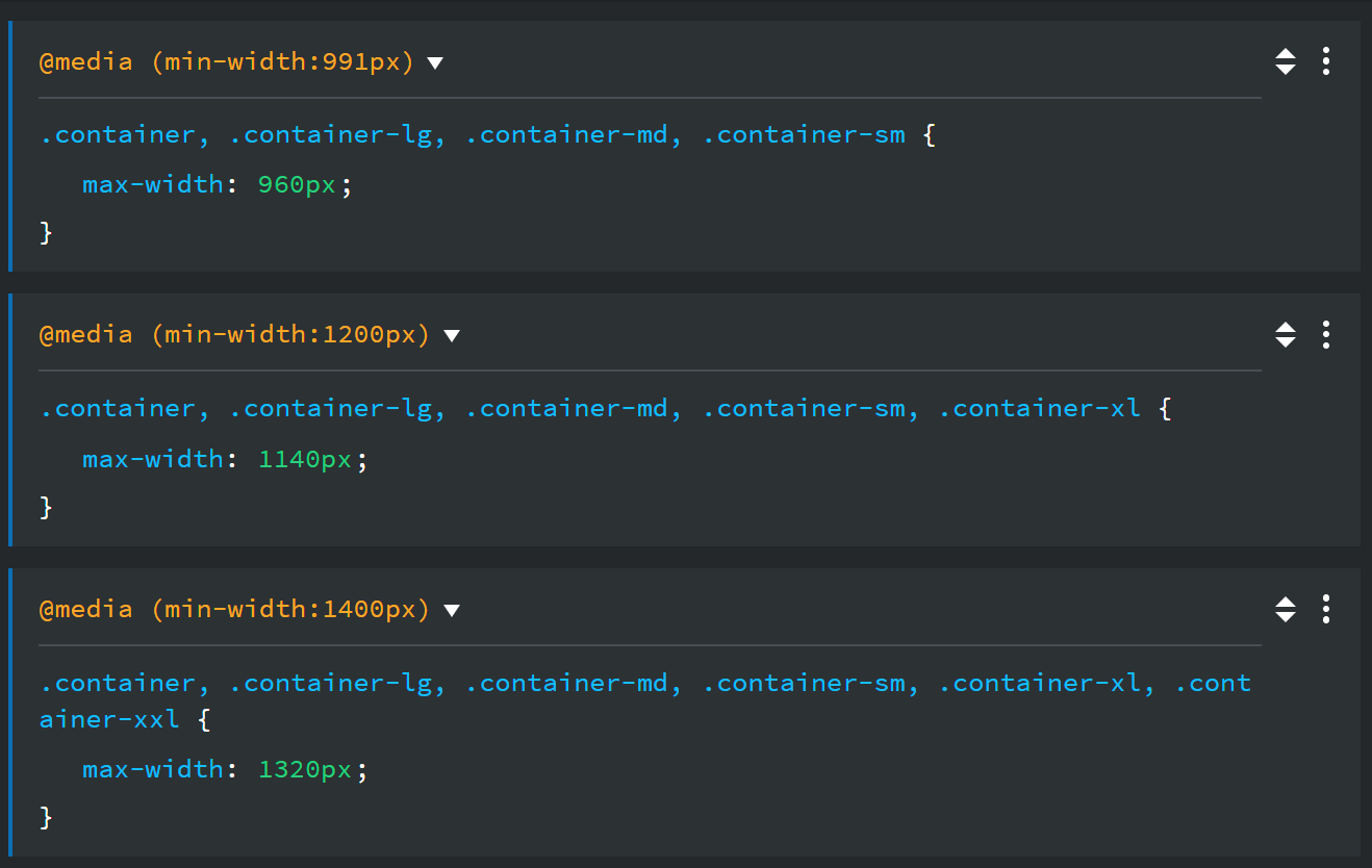 So for a normal .container, the 992px media query is the LG breakpoint, and 960px is the correct max-width there. Then at 1200px, the 1140px rule overrides it for XL. That part is standard Bootstrap.
