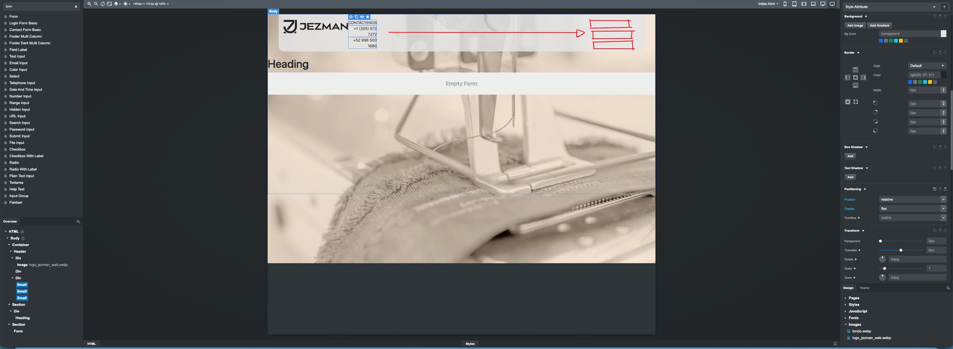 Typically, positioning within divs would be done using flexbox, but the div also has to have certain attributes (position, width, etc.) in order for flexbox rules work correctly. In most cases, it’s easier and better to use Bootstrap’s pre-made grid system (containers, rows, columns) to position elements, rather than trying to create stuff from scratch using divs.