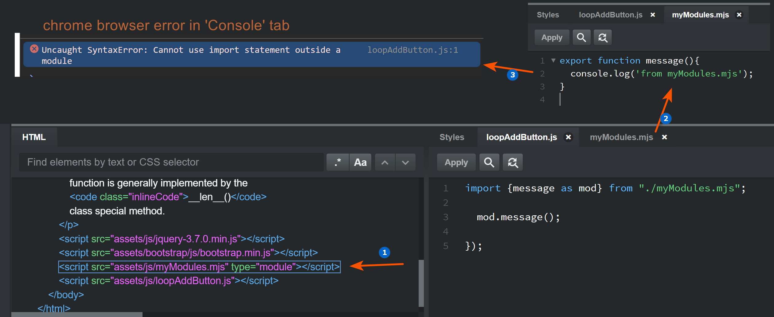 i am enclosing a screenshot the show the 3 parts of my issue when I try to import a module.mjs file and use a function. its a simple example, but I get an error in chrome browser…